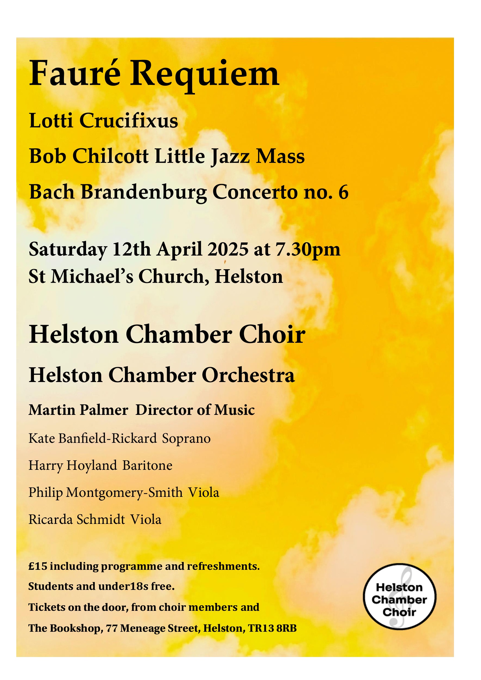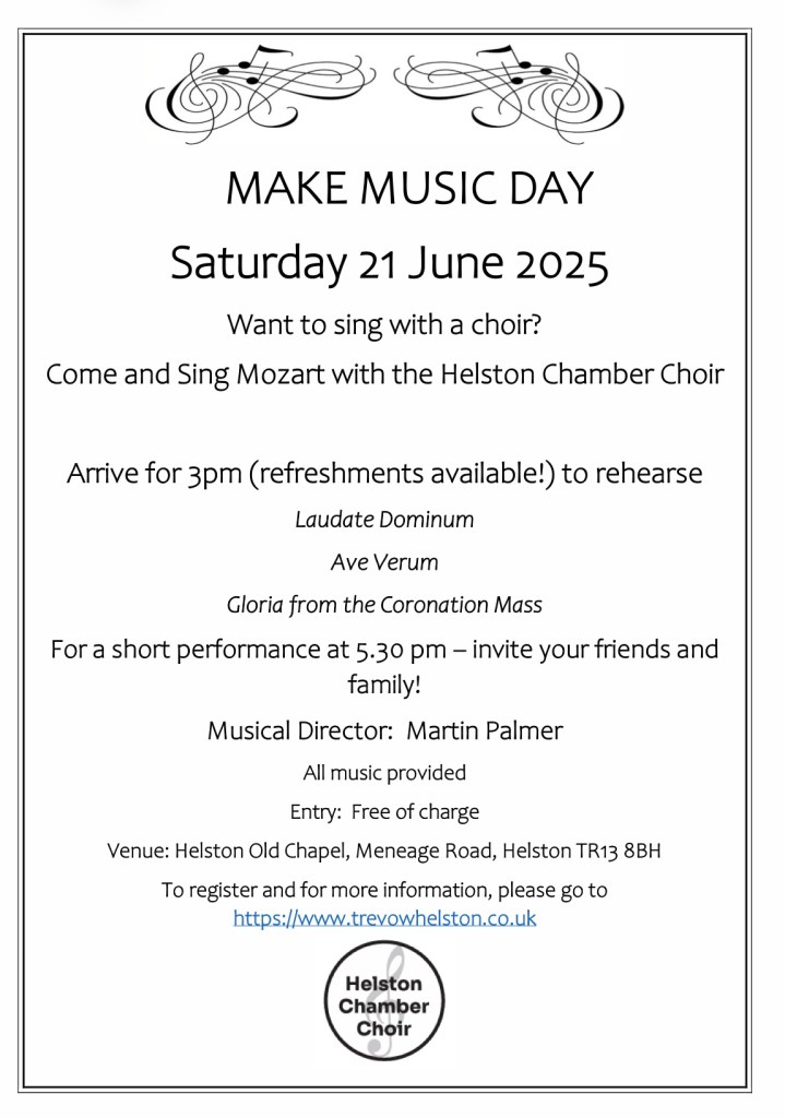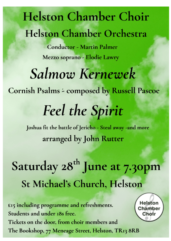The AudienceCharlotte Osman Flautist solocontemplation before the performancedress rehearsalFlowers from local daffodil farmer, Paul WilliamsInterval refreshments for the audience – Thanks, catering queen, Lucy Lucey!Mayor of Helston – Nicola BoaseElodiemusician and choir supper after dress rehearsalThe TenorsJune 28th 2025 Concert – Russell Pascoe – Salmow Kernewek, John Rutter – Feel the Spirit, Aaron Copland – Fanfare for the Common ManScreenshotMartin Palmer leads participants in learning Mozart from scratch at the Make Music Day on Jue 21st 2025Lucy Coombes welcomes to Make Music DayApril 12th 2025 concertThe Choir in a rehearsalThe wonderful St Michael’s Church where we rehearse and performThe 2025 Poet Laureate of Penryn! – Jeni Whittaker Our Chair, Susannah Garland, and membership secretary, Lucy CMartin Palmer was given a surprise -a cake for his birthday